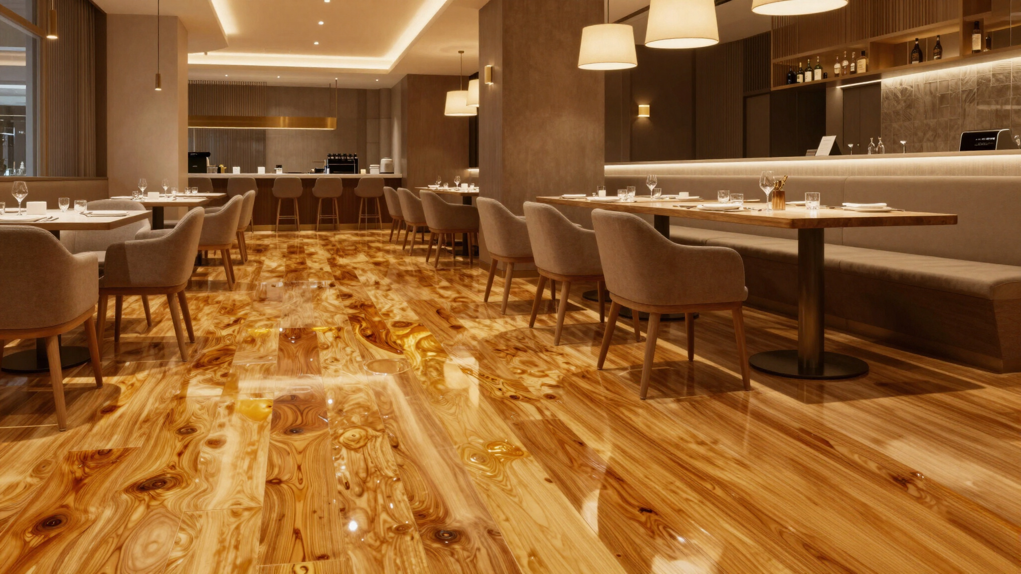 Seamless, spill-resistant surfaces for restaurants, luxury bars, and hotels where premium aesthetics meet utility.